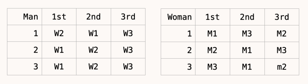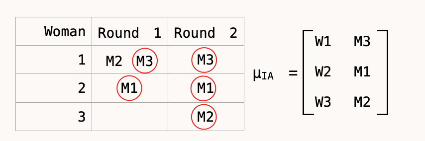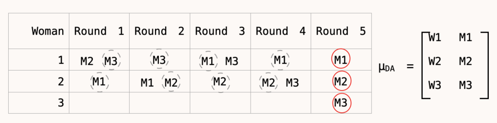 Deferred acceptance: Here each round the men go to the women who is highest on their list of preferences, the women tentatively accepts their favourite option and reject the rest. The next round if you have been tentatively accepted you stay where you are otherwise you move to the woman who is next highest out of your preferences.