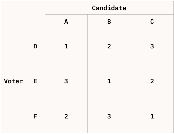 In the example above if you take any two candidates one of them is always preferred to the other. However, when you look at the group as a whole no candidate if the overall preferred choice. What seems like a simple situation has turned into a strange political rock, paper, scissors.